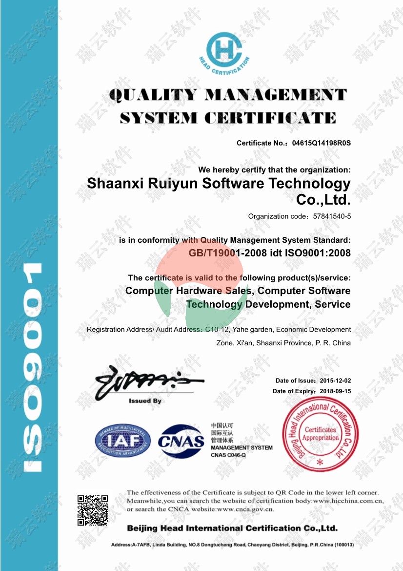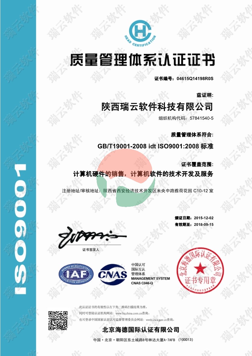 獲得ISO9000質量管理(lǐ)體系認證是公司規範化管理(lǐ)新的(de)起點,瑞雲軟件将在規範化管理(lǐ)的(de)大道(dào)上奮勇前進!